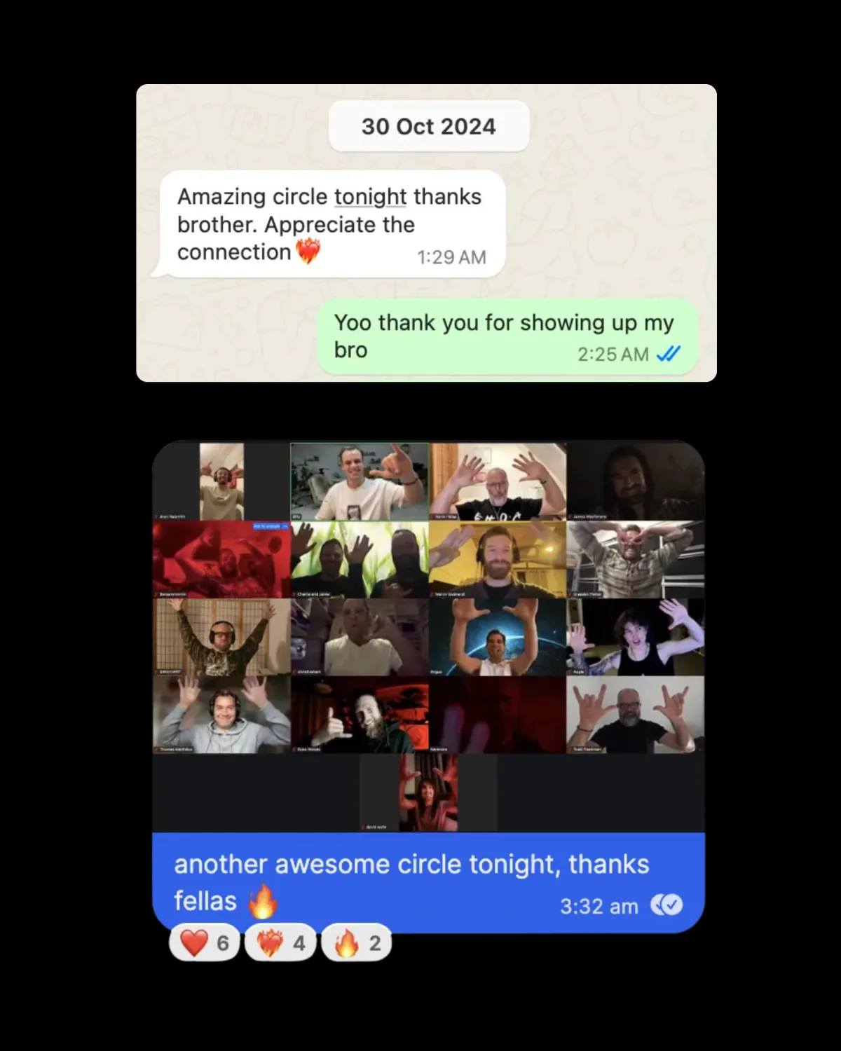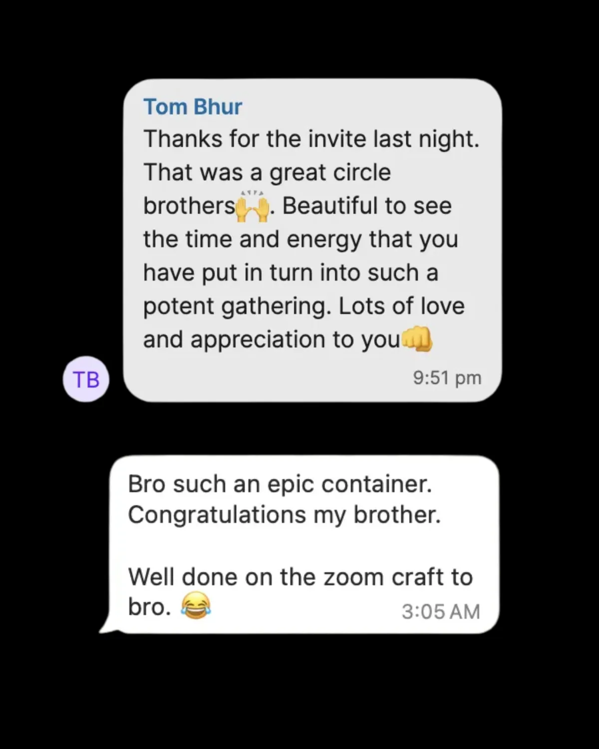 Each circle is held by trusted BROS facilitators — grounded, real men who are doing the work and know how to hold the space. No egos, no gurus. The facilitators may change each month, but you can be assured that we put a lot of time into preparation and holding the right vibe with the people we associate with.